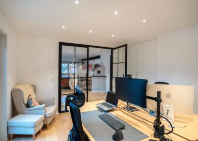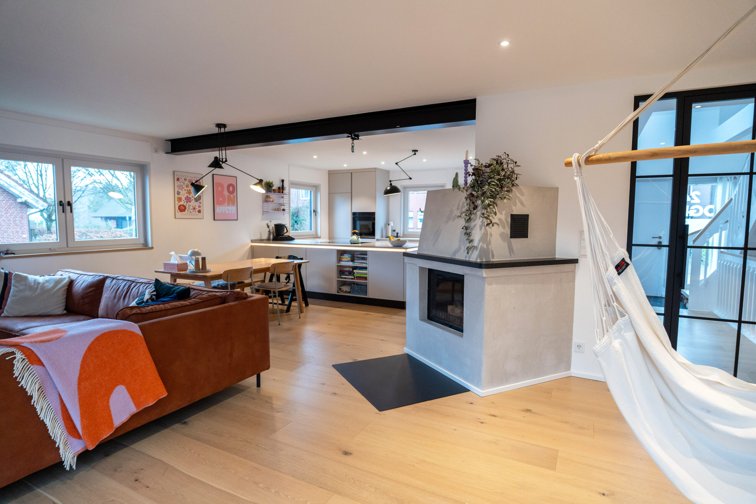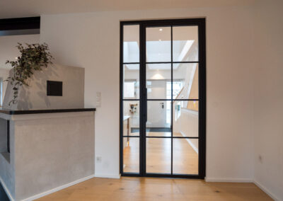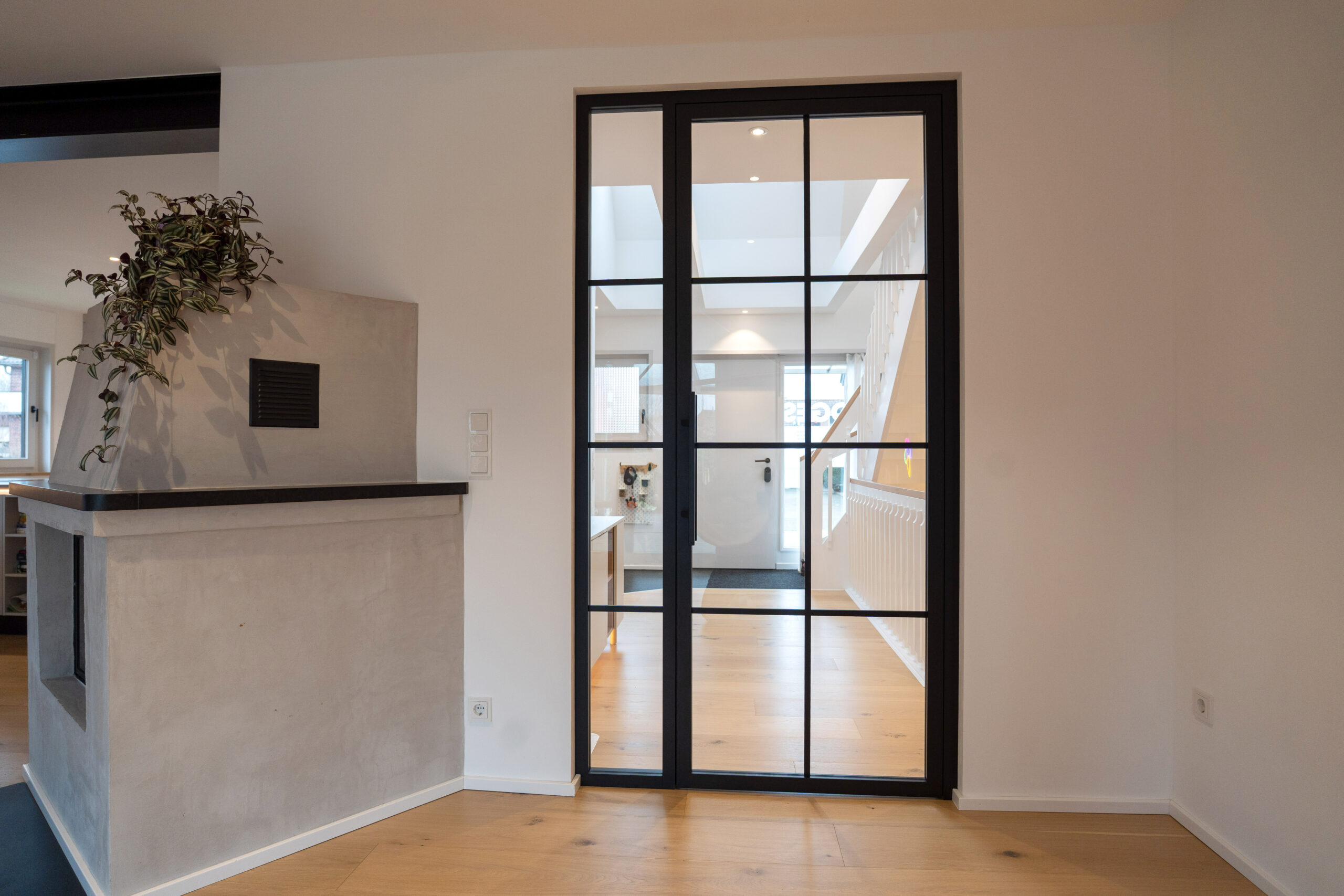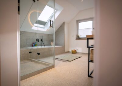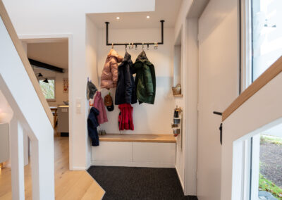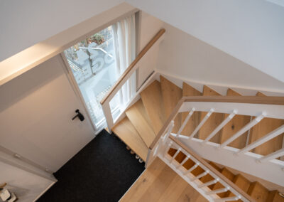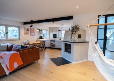 Wenn die ältere Generation ein gut gepflegtes Einfamilienhaus an die jüngere Generation übergibt, dann … muss alles neu. Zumindest wollte dies die junge Familie bei dem in Holzrahmenbauweise errichtetem Gebäude aus den 80er Jahren. Die Neugestaltung der Böden und der Treppe mit modernen Farben und Materialien und der neu angelegte großzügige Luftraum im Eingangsbereich sorgen nun für eine Wohlfühlatmosphäre direkt beim Betreten des Hauses. Beide Bäder wurden vollständig erneuert und der vorhandene Kaminofen dem neuen Look angepasst. Im EG wurde die Aufteilung der Räume insgesamt offener für das gelebte Familienkonzept konzipiert und umgebaut. Im Ergebnis ist genau das entstanden, was von den Bauherren gewünscht war. Ihr eigenes „neues“ Heim.