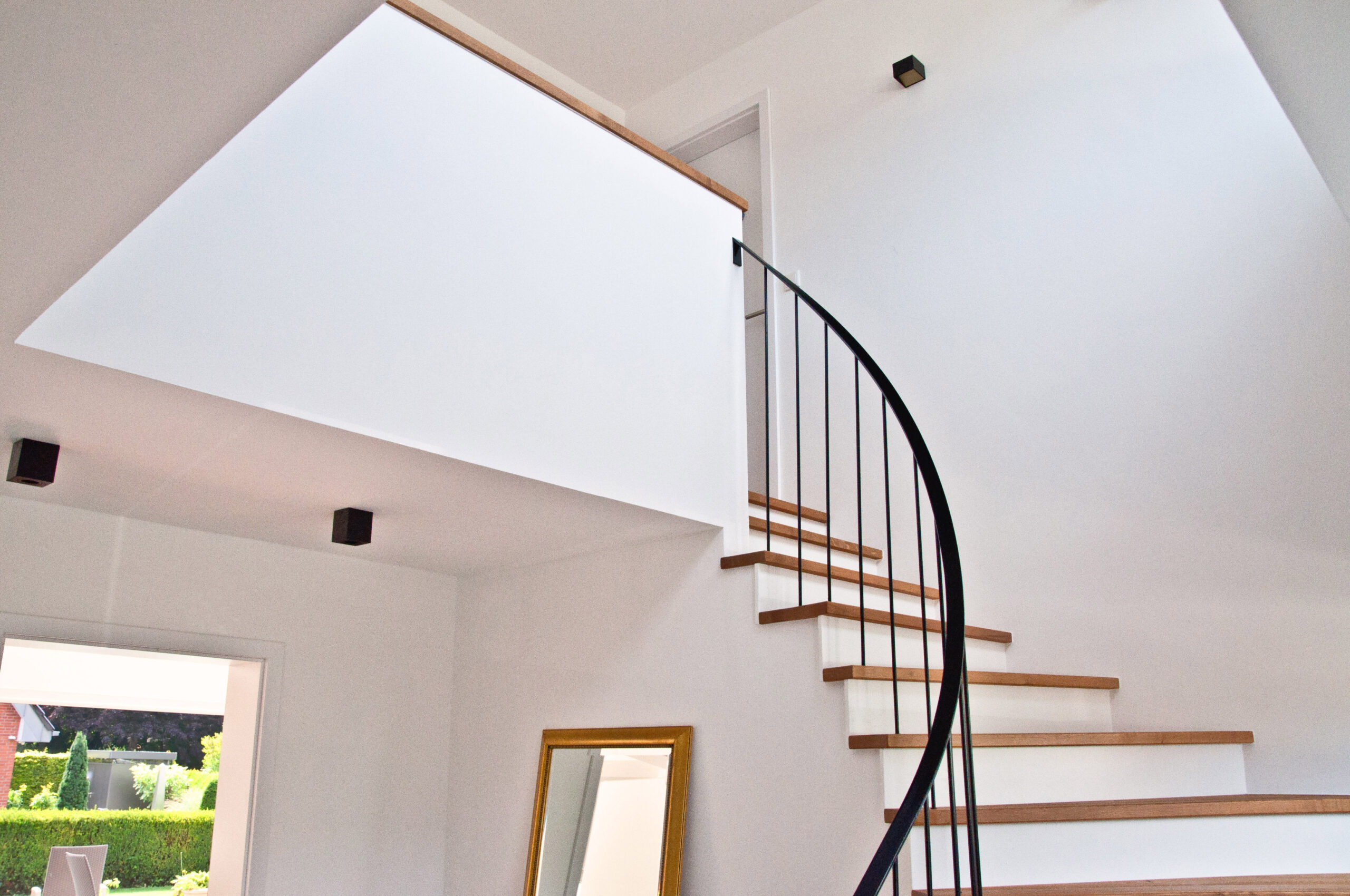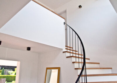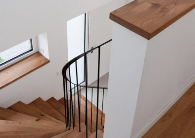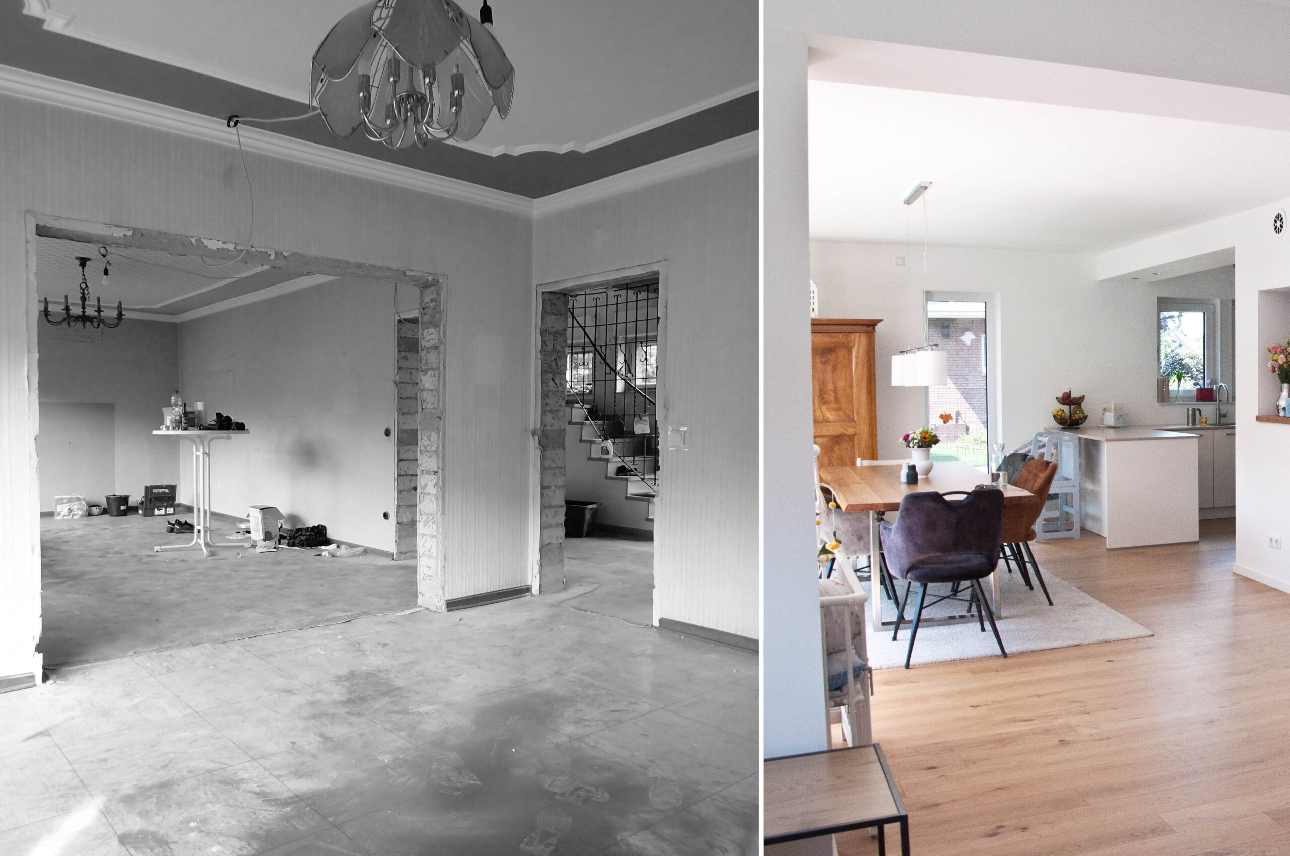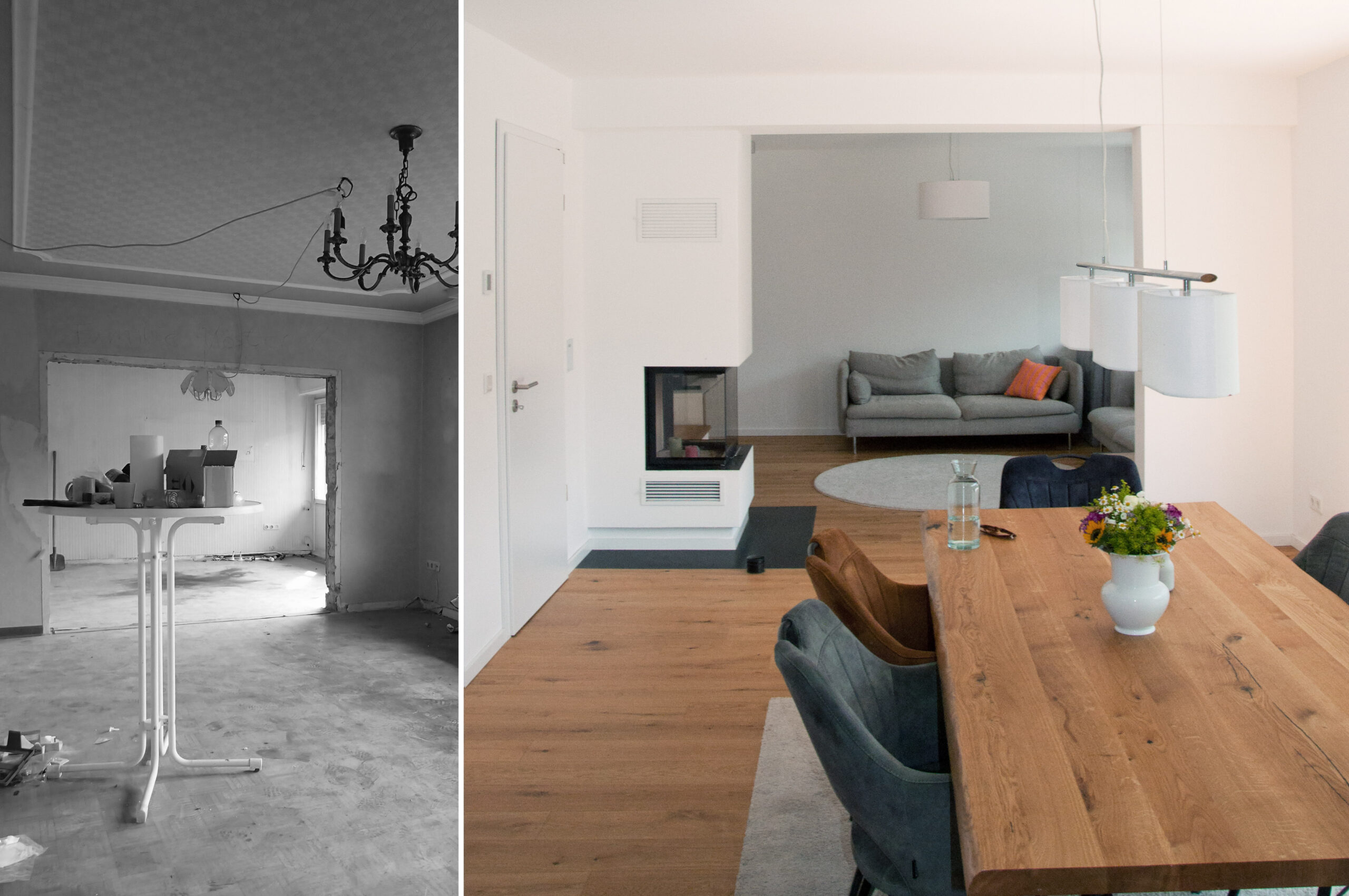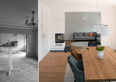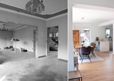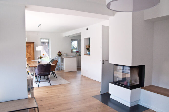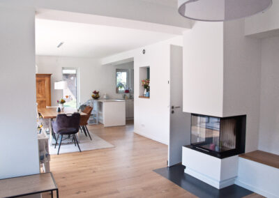 Der bauliche Zustand dieses Einfamilienhauses aus den 60er Jahren war nicht mehr zeitgemäß. Der Zugang zum Dachgeschoss war nur sehr eingeschränkt möglich und die Raumaufteilung war im Gesamten sehr kleinteilig und entsprach vor allen Dingen nicht den Ansprüchen der neuen Eigentümer. Der energetische Zustand des Gebäudes war seit Errichtung weitestgehend nicht verbessert worden. Das Gebäude wurde nun komplett entkernt und Wände wurden entfernt um Räume zu vergrößern oder zu verbinden. Im Eingangsbereich wurde durch den Rückbau der Betondecke ein großzügiger Luftraum hergestellt. Durch Aufdopplung der Dachsparren, Aufbringung eines Wärmedämmverbundsystemes mit Klinkerriemchen und den Einbau einer kontrollierten Wohnraumlüftung nebst einer Wärmepumpe konnte ein gut förderfähiger Energiestandard hergestellt werden.