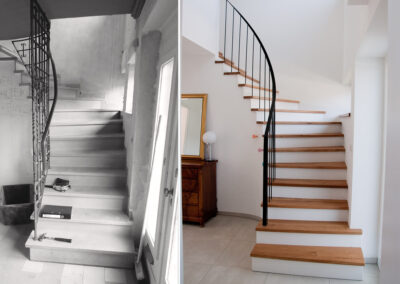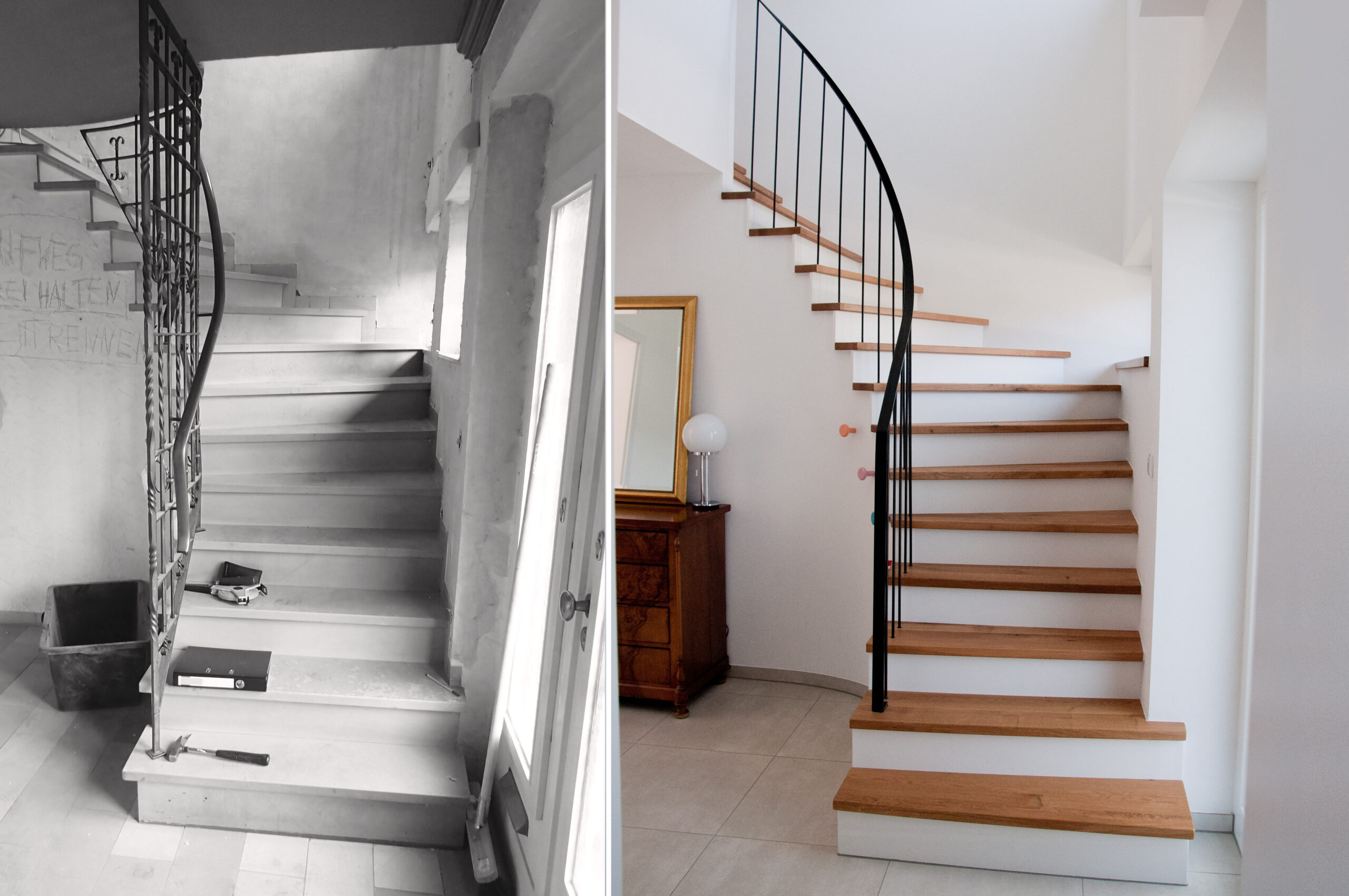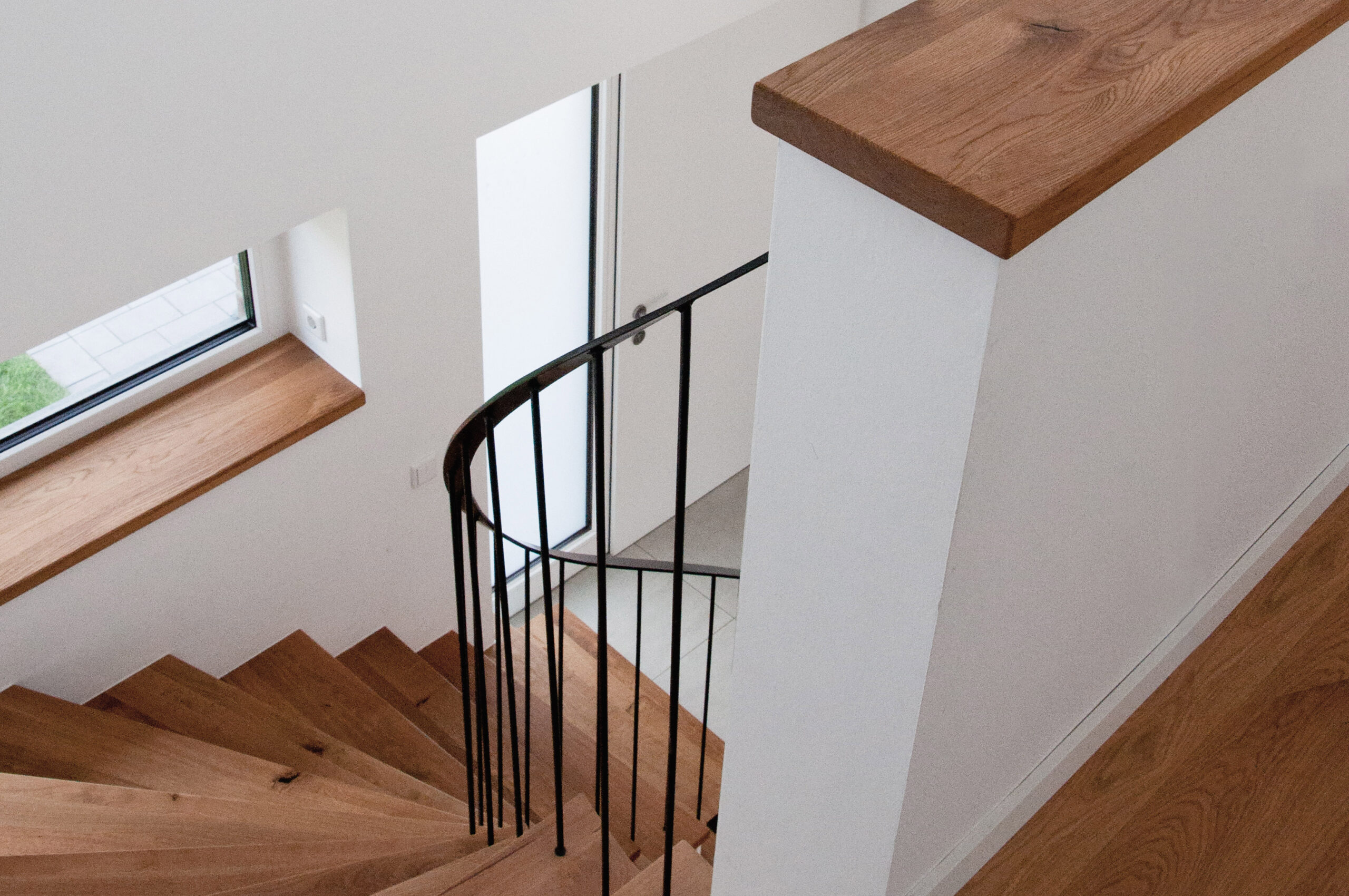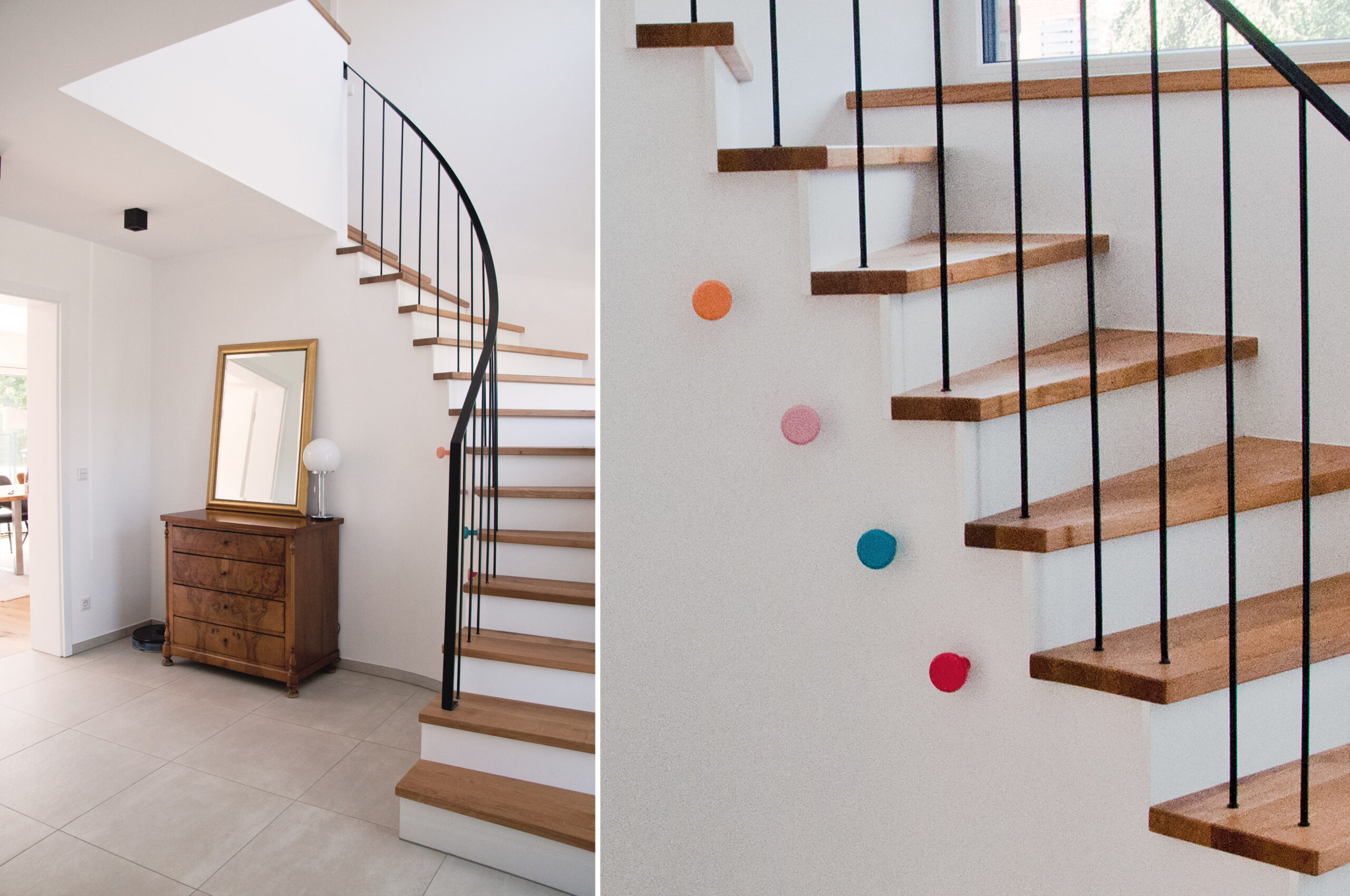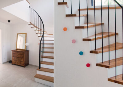 Der bauliche Zustand dieses Einfamilienhauses aus den 60er Jahren war nicht mehr zeitgemäß. Der Zugang zum Dachgeschoss war nur sehr eingeschränkt möglich und die Raumaufteilung war im Gesamten sehr kleinteilig und entsprach vor allen Dingen nicht den Ansprüchen der neuen Eigentümer. Der energetische Zustand des Gebäudes war seit Errichtung weitestgehend nicht verbessert worden. Das Gebäude wurde nun komplett entkernt und Wände wurden entfernt um Räume zu vergrößern oder zu verbinden. Im Eingangsbereich wurde durch den Rückbau der Betondecke ein großzügiger Luftraum hergestellt. Durch Aufdopplung der Dachsparren, Aufbringung eines Wärmedämmverbundsystemes mit Klinkerriemchen und den Einbau einer kontrollierten Wohnraumlüftung nebst einer Wärmepumpe konnte ein gut förderfähiger Energiestandard hergestellt werden.